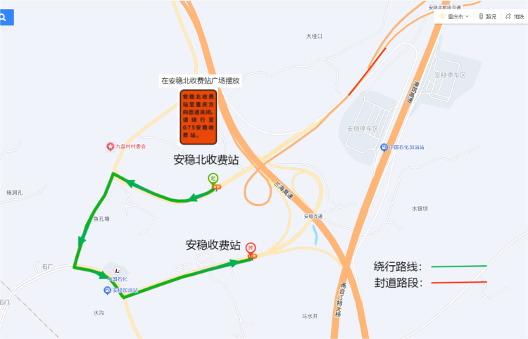 2.临时关闭安稳北收费站至重庆方向上道匝道;封闭时间为4月10日7时至4月30日9时。G7521安稳北收费站前往重庆方向的车辆在广场掉头,从地方道路绕行至G75安稳收费站至兰海高速重庆方向。